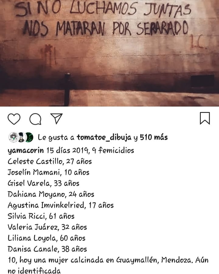 “Porque lloramos a Joselin Mamani (10 años, asesinada de 32 puñaladas en Buenos Aires); Gisela Romina Varela (33 años) y Susana Yass las dos de Mar del Plata; Daiana Moyano (24 años, asesinada en Córdoba); Silvia Ricci (32 años, asesinada en Buenos Aires); Liliana Loyola (64 años, fue prendida en San Juan); Valeria Juárez en Chaco; Agustina Imvinkelried, de 17, en Santa Fe, Denise Canale… y no queremos sumar otra más. Durante 2018 fueron 260 las víctimas, según el Registro Nacional de Femicidios. ¿Cuántas más tenemos que morir para que abran los ojos? El Estado es responsable”, sostuvieron desde la Comisión de Actrices Tucumanas Autoconvocadas, mencionando a cada nueva víctima de femicidio en lo que va del año.