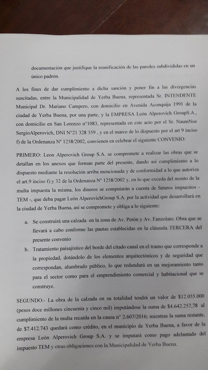El convenio firmado la semana pasada establece la obligación de solventar la construcción de la calzada solicitada, de 8.250 metros cuadrados en el plazo de 12 meses que comenzarán a correr desde que la Municipalidad concluya con el desmalezamiento del lugar. Además, Alperovich deberá solventar los elementos arquitectónicos, de seguridad y de alumbrado público.